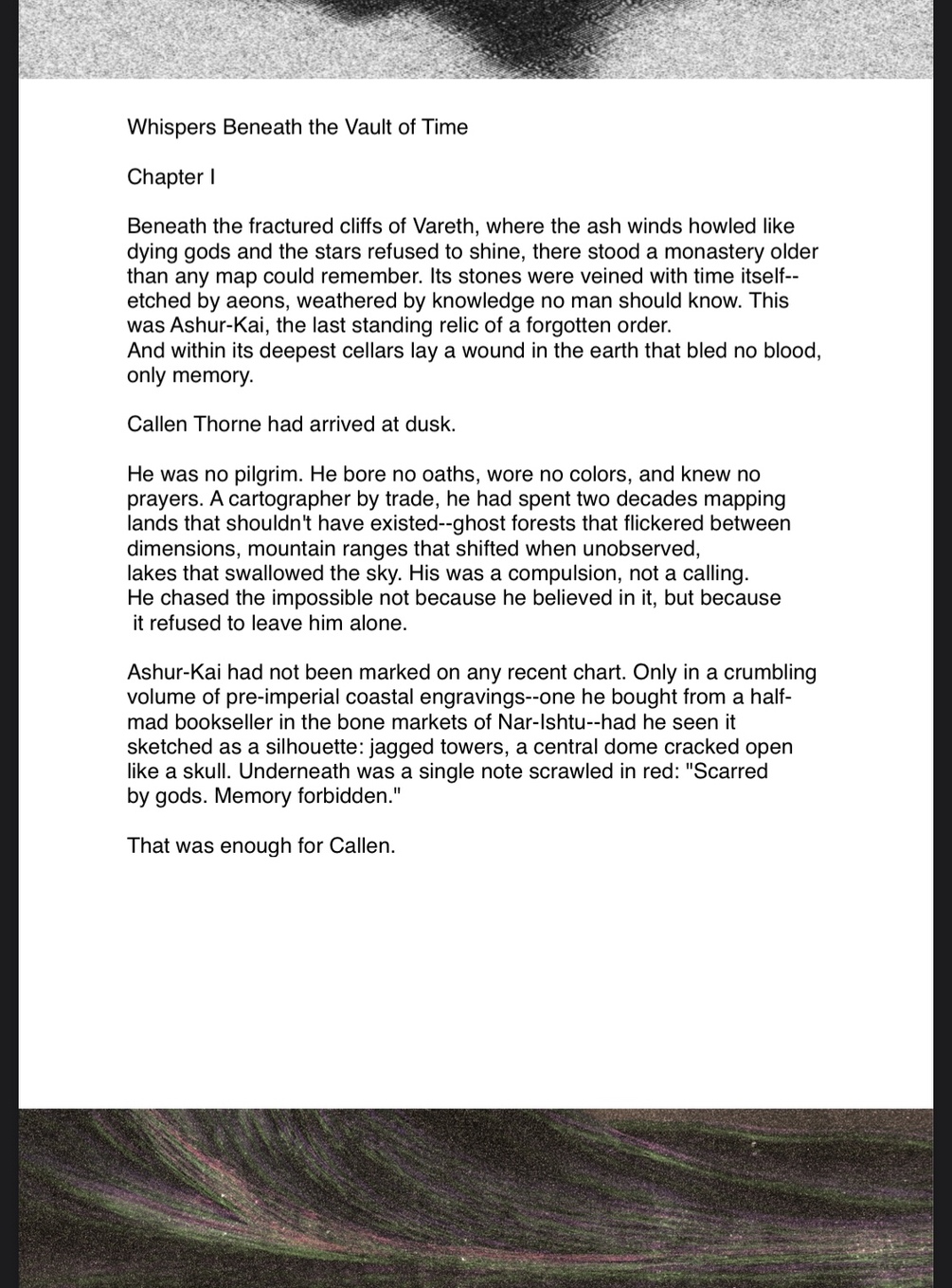"Whispers Beneath the Vault of Time" is a descent into forgotten worlds, decaying gods, and the deep-time scars of reality. It is a cosmic horror narrative told through richly poetic prose, inspired by the mythos of Lovecraft, the cryptic texts of the Necronomicon, and the metaphysical dread of time as a living force. At its core is a lone cartographer, Callen Thorne, whose obsession with unmapped ruins leads him to Ashur-Kai—a monastery buried in stone and memory, where time itself rots.
